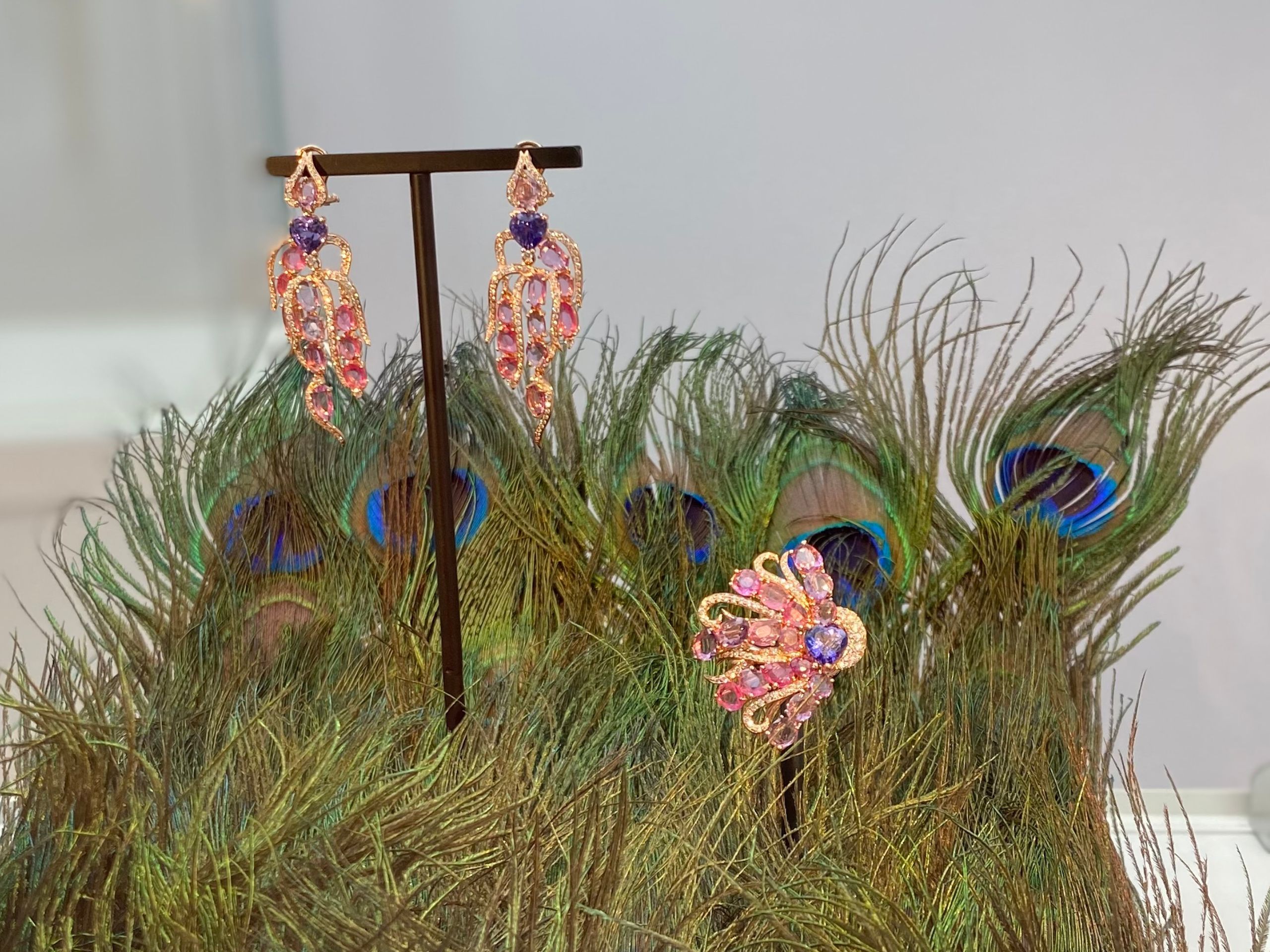 La parure, composta da un anello e da un paio di orecchini, è realizzata in oro rosa e si sviluppa in una palette cromatica di toni rosa cipria, blu e viola, dai riflessi delicati e cangianti. Le gemme scelte sono incastonate in linee sinuose che rievocano il movimento ondoso delle piume di pavone.